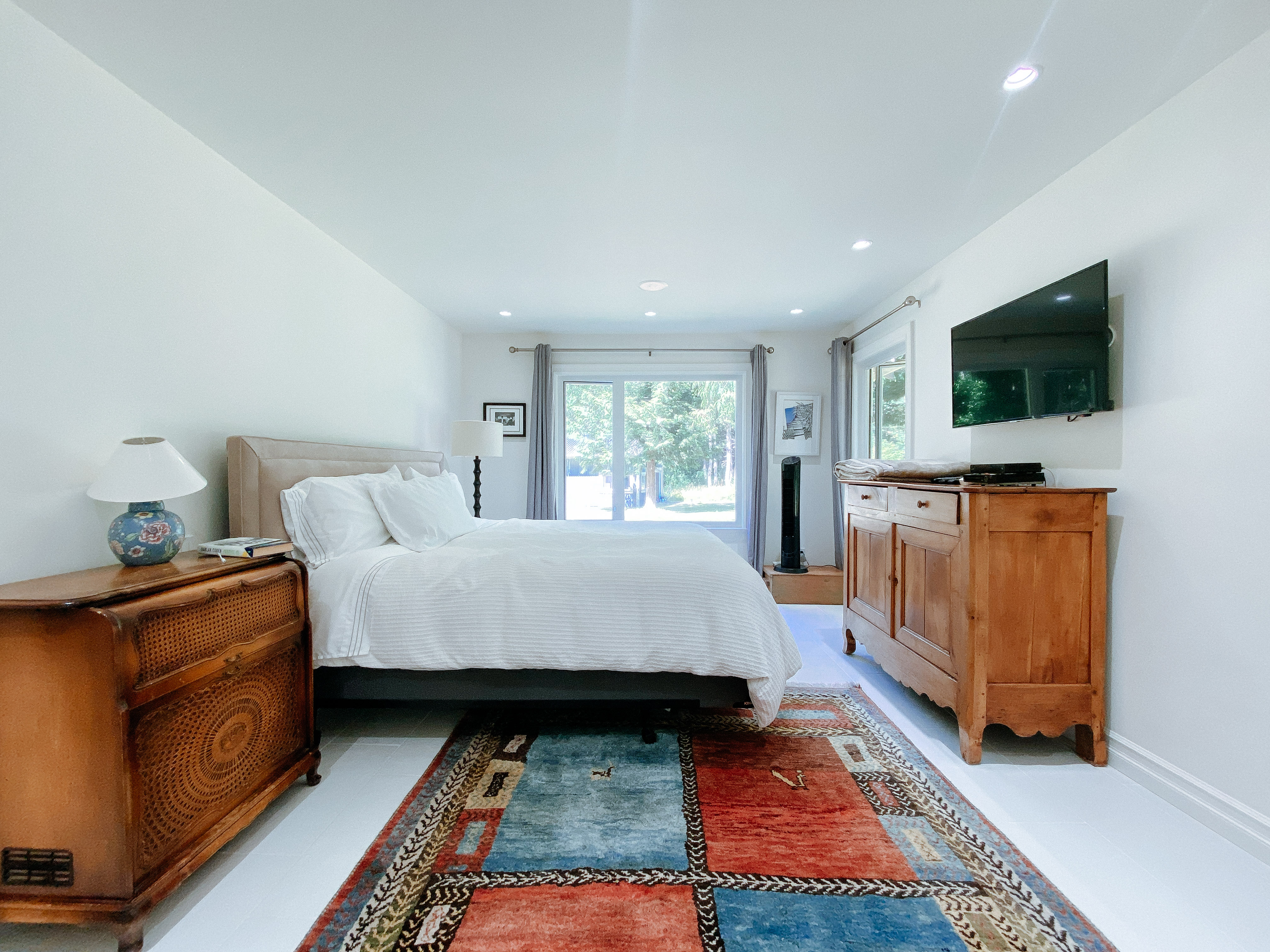- 1 level with 1 ensuite master suite with tub and shower on main level and another bedroom with bathroom with fantastic shower on main level (total of 2 full bathroom and 2bedrooms with King bed and Queen bed)